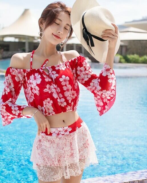 ボタニカル柄にレースのフレアスカートタイプのボトムがビーチで映えます。